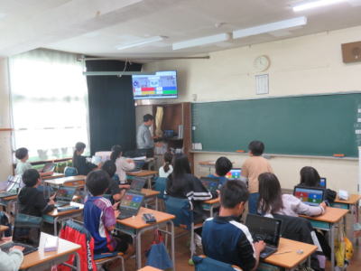 4年生の教室では、元担任である3年生の先生が補教に入っていました。課題が終わった残りの時間でことわざのクイズをカフートで出題してくれました。