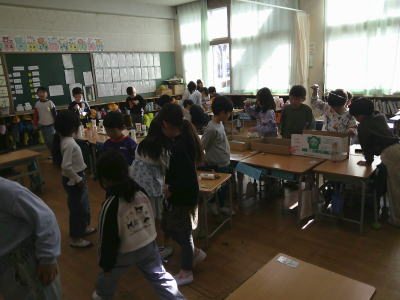 1年生は、生活科で作った「秋のものつかったおもちゃ」でお店を開き、3クラス合同でお店屋さん交流を行いました。