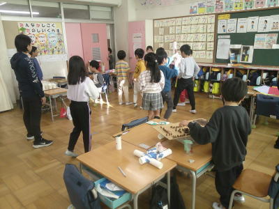 1年生は生活科で「秋のものをつかったおもちゃ」を作って遊んでいました。