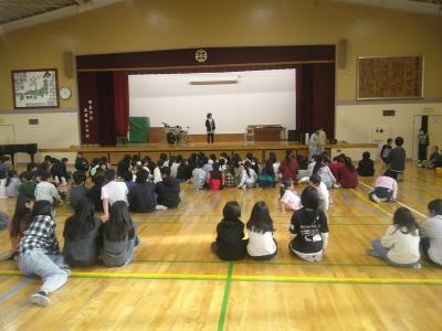 月のはじめの火曜日は全校朝会です。今日は2年生が一番乗りでした。他の学年も時間どりに体育館に集合することができました。