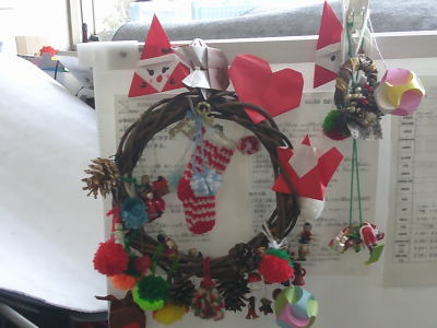 よむよむスタジアムには、みんなが図書室で折ってくれたサンタさんがたくさん飾られています。