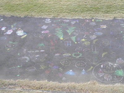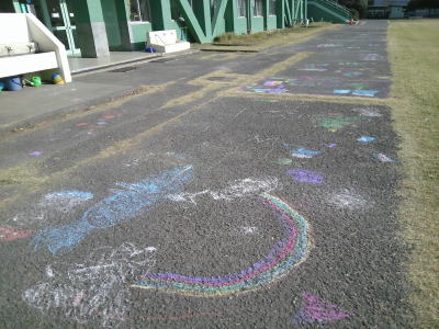校庭にチョークで描かれたかわいらしい絵がありました。
