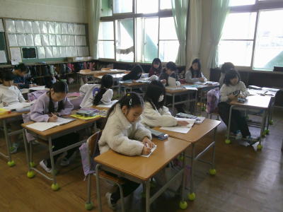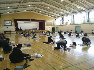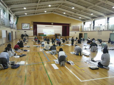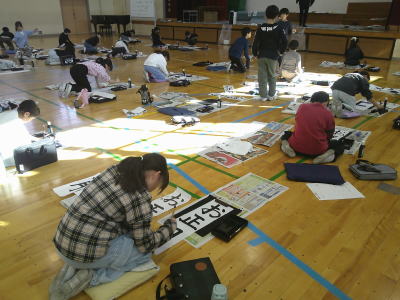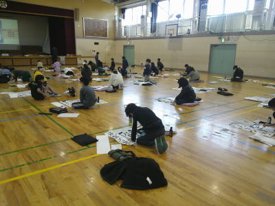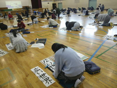 昨日の5・6年生に続き、今日は3・4年生も体育館で席書会です。写真は1時間目の4年生。