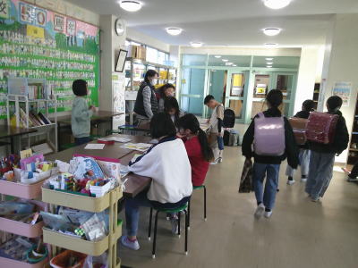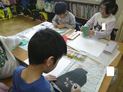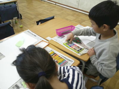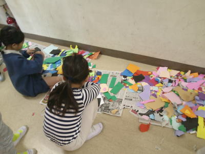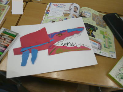1年生のセンスが光ります。先生たちはこの学習のために、これまで使った色画用紙の切れ端を捨てずにとっておいているそうです。3クラス同時に行っています。後でお互いの作品を見合うのも楽しみですね。