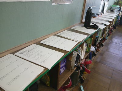 教室の後ろには、大量の練習プリントが並んでいました。繰り返し問題を解き、確実に力をつけていきましょう。