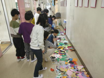 1年生の教室の廊下に、大量の色画用紙の切れ端が並べられています。
