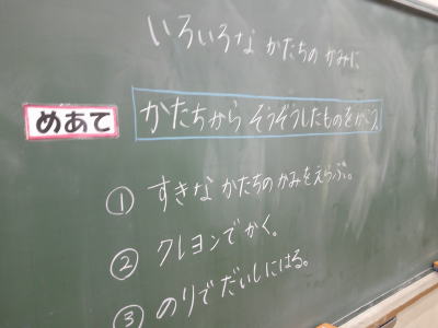 形から想像したものを貼り、絵にしていく図工の学習です。