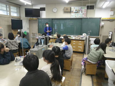 温度による水の体積の変化を確かめていました。試験管の中の水がお湯で温められて増えているのが分かります。この後、氷水で冷やす実験も行うそうです。