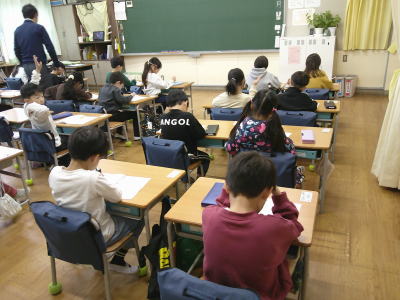今週は、市販のテストを使いながら全学年で学力調査を行っています。写真は3年生。みんな真剣に問題と向き合っています。