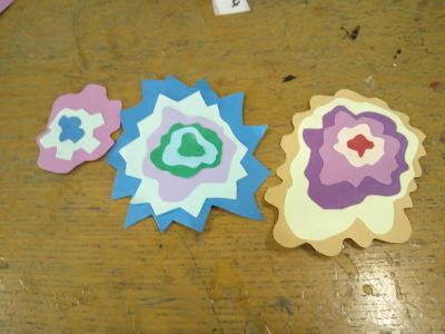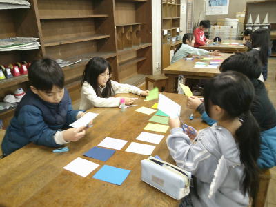 色紙を切って、上の写真のようなものを作ってい来ます。中心部分の最初の形が「たね」となるそうです。