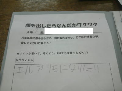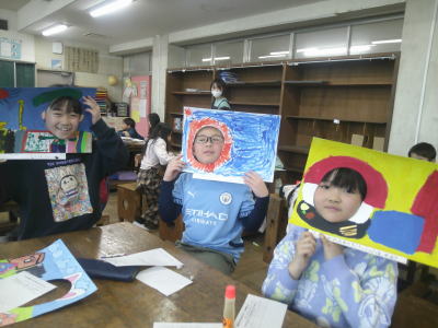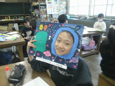 「顔を出したらなんだかワクワク」出来上がった作品を班で共有しているところでした。