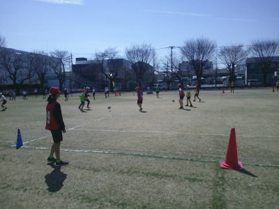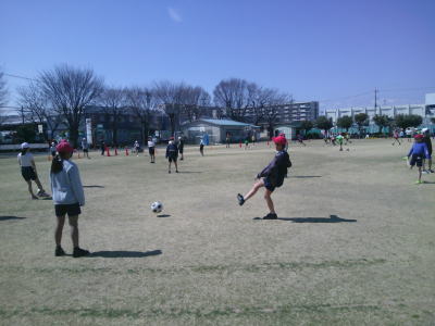 5年生は、サッカー型のゲームに取り組んでいます。東側は、男女混合のチームで練習をしています。