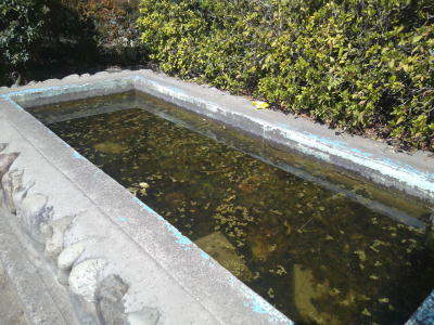 校庭前の池の様子です。メダカはまだ、さほど活発に泳いでいませんがよく見るとヌマエビたちが盛んに藻などのエサをあさっています。