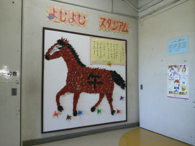 2月のよむよむスタジアムには「午年」にちなんで、「馬」の折り紙アートが飾られています。今月も図書支援員の皆さんが作ってくれました。いつもながらのセンスの良さに、思わず足を止めて見入ってしまします。午年の一年も、この馬のように軽やかに駆け抜けましょう。
