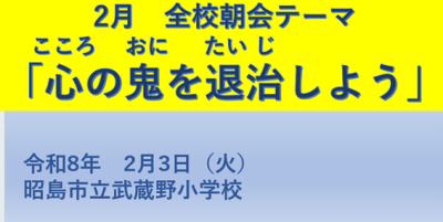 5時間目の2年生の国語の時間です。一人一人が自分の追い出したい鬼とその理由をノートに書いていました。「なまけオニ」「おこりオニ」「わがままオニ」「ゲームオニ」などたくさんの種類の鬼がいました。今日、豆まきをするときに、しっかり追い払いましょう。