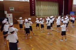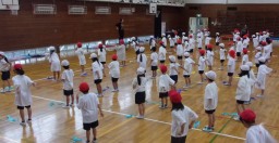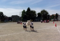 1・2年生合同の団体競技の練習をしています。中神小学校の60歳をお祝いする気持ちも込め、大事なバースデーケーキを運びます。できるだけ落とさないよう協力しながら、競技性も高めています。2年生の動きを見ていると、1年間の子供たちの成長の大きさを実感します。今、1年生にできることを精一杯に頑張ります。  |