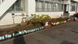 生活科の学習でチューリップの球根を観察し、一人ずつ花壇に植えました。球根が植えられていることをみんなに気付いてもらうため、「夢のチューリップ」を絵に描き、ガーデンフェンス代わりに設置しました。温かく想像力豊かな花が球根を守る役割を果たしてくれると思います。学校にお寄りの際には、ぜひ、冬に咲いた可愛らしいチューリップをご覧ください。 |