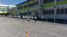 1・2年生合同の団体競技の練習をしています。中神小学校の60歳をお祝いする気持ちも込め、大事なバースデーケーキを運びます。できるだけ落とさないよう協力しながら、競技性も高めています。2年生の動きを見ていると、1年間の子供たちの成長の大きさを実感します。今、1年生にできることを精一杯に頑張ります。 |