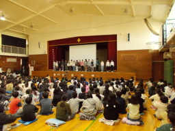 7/15(火)に行われたMC朝会の練習の様子です。5年生の発表曲「ともだちだから」を学年で練習しました。アルトとソプラノに分かれて、かけ合いの部分や音が重なる部分を意識して、一人一人の声を聞いている人にまっすぐ届けられるように取り組みました。 |