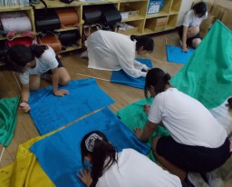 |  運動会の表現に使うフラッグ。本番で自分たちが最高の演技ができるように、応援メッセージをフラッグに書いています。休み時間には、友達同士でメッセージを書き合う様子や、お世話になっている先生に書いてもらっている様子が見られます。 様々な方からの思いと関わってくださった方への感謝の気持ちをのせて、ラストダンス届けます!!!  |
