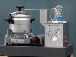発電所の仕組みを模型にしたもので電気を作る実験では、蒸気がモーターを回し発電される様子を見せてもらいました。