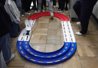 最後に子供たちは、手回しの発電機を自分たちで回してミニ四駆に電気を貯め、ミニサーキットを走らせました。