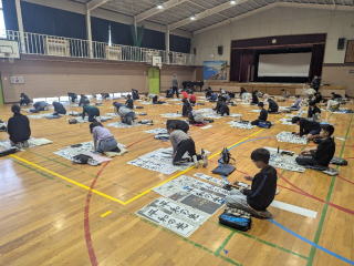 どの子も真剣で、静かな体育館で思いのこもった書を書きあげました。
