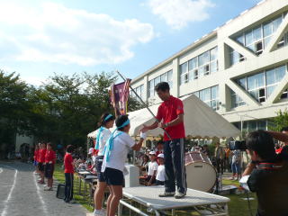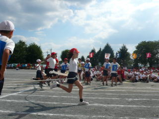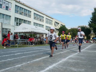 各クラスの代表がバトンをつなぎ勝利に向かって走ります |